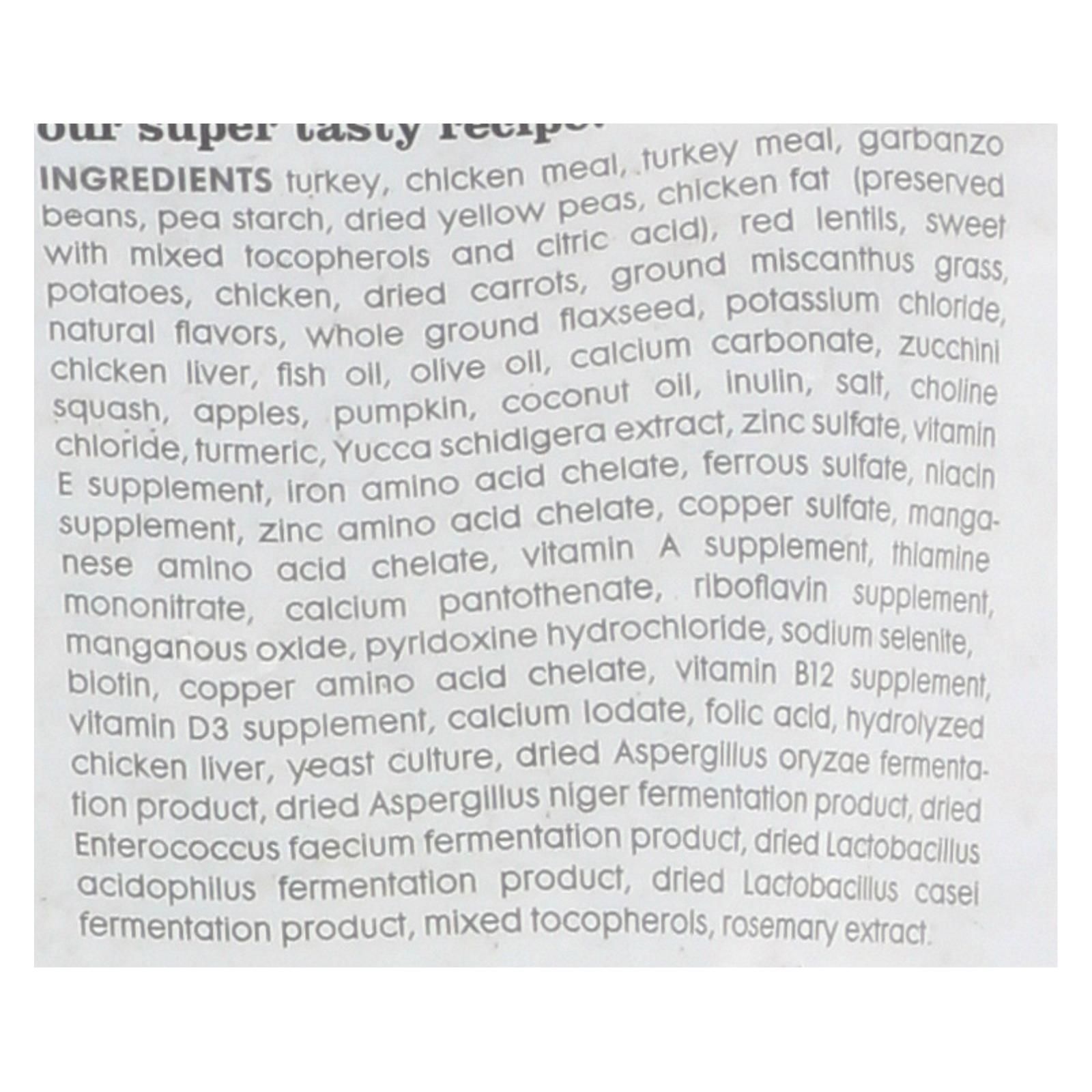 ingredients : turkey;chicken meal;turkey meal;chickpeas;red lentils;pea starch;peas;chicken fat;preserved with mixed tocopherols and citric acid;sweet potatoes;chicken;dried carrots;ground miscanthus grass;natural flavors;potassium chloride;whole ground flaxseeds;chicken liver;fish oil;vitamin a supplement;vitamin d3 supplement;vitamin e supplement;niacin supplement;pantothenic acid;pyridoxine hydrochloride;riboflavin supplement;folic acid;biotin;vitamin b12 supplement;olive oil;apples;hydrolyzed chicken live