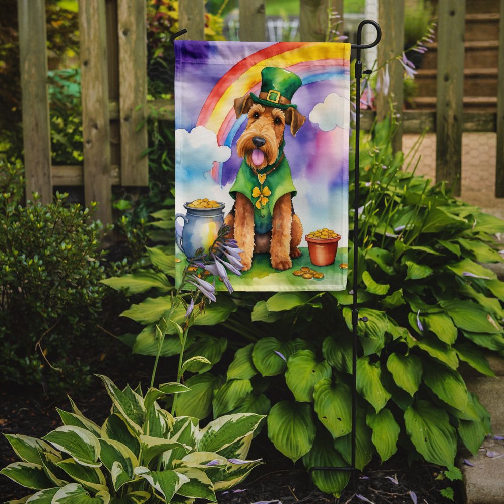 Garden Flag featuring breed specific Airedale Terrier artwork. Celebrate St Patrick's Day with this St Patrick's Day Garden Flag. Enhance the beauty of your garden, patio, or yard with Caroline's Treasures Decorative Garden Flag, proudly made in the USA. Crafted from two pieces of thick, double-sided polyester fabric, this 2-ply garden flag is designed to withstand various weather conditions, making it water-resistant and weatherproof. Featuring correctly readable words on both sides, this garden flag offers a delightful visual experience from any angle. With its heavier weight, it stands out among other garden flags, ensuring stability and durability even in wind, rain, and snow. Measuring approximately 11 1/4 inches by 15 1/2 inches, this flag allows you to personalize your outdoor decor. It comes with a 1 1/2-inch sleeve sewn in, allowing easy attachment to any standard garden flag stand or garden size porch hanger (sold separately). Make a statement in your outdoor space with Caroline's Treasures Decorative Garden Flag, a vibrant and high-quality flag that adds color and personality to your surroundings. Proudly made in the USA, it's a symbol of quality craftsmanship and attention to detail.