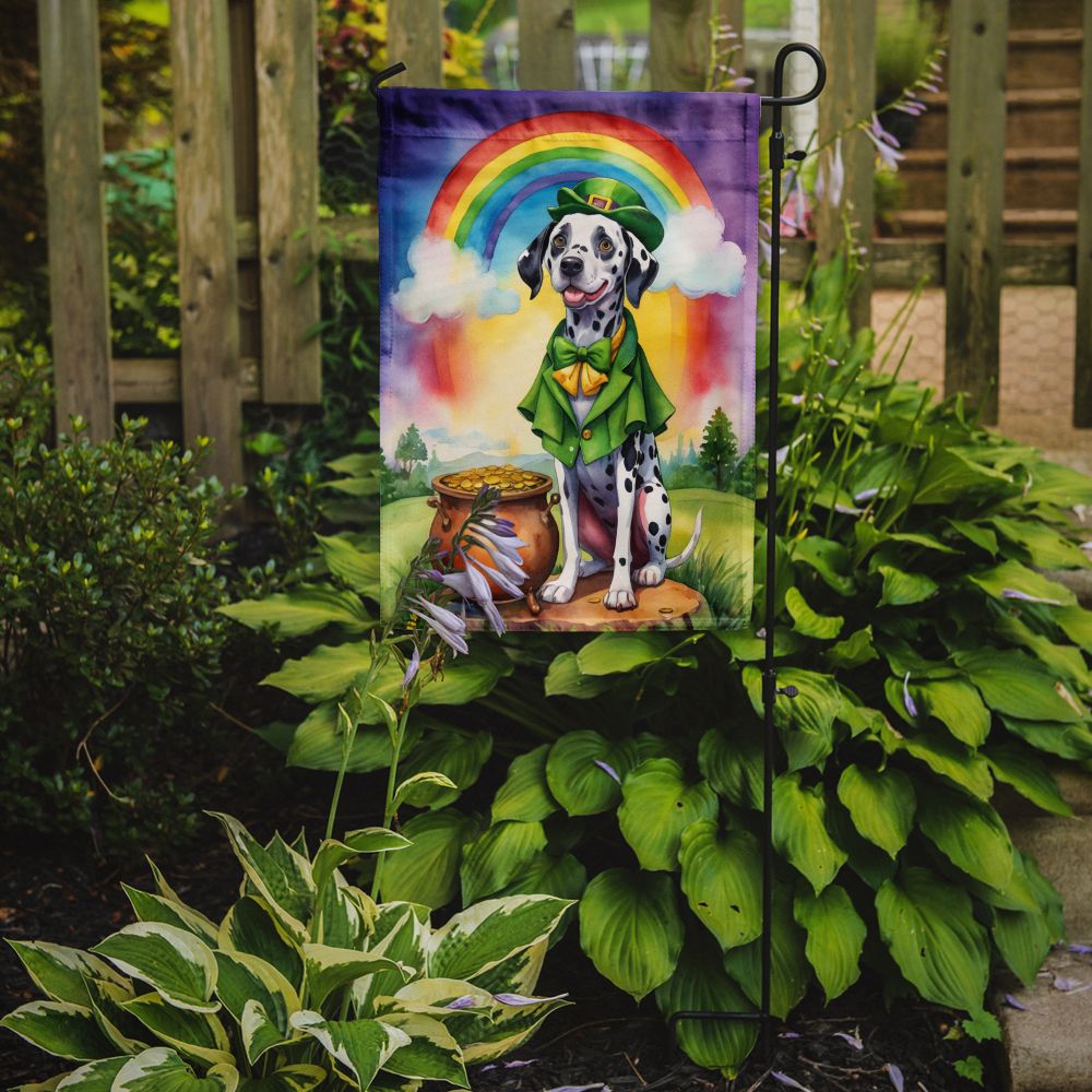 Garden Flag featuring breed specific Dalmatian artwork. Celebrate St Patrick's Day with this St Patrick's Day Garden Flag. Enhance the beauty of your garden, patio, or yard with Caroline's Treasures Decorative Garden Flag, proudly made in the USA. Crafted from two pieces of thick, double-sided polyester fabric, this 2-ply garden flag is designed to withstand various weather conditions, making it water-resistant and weatherproof. Featuring correctly readable words on both sides, this garden flag offers a delightful visual experience from any angle. With its heavier weight, it stands out among other garden flags, ensuring stability and durability even in wind, rain, and snow. Measuring approximately 11 1/4 inches by 15 1/2 inches, this flag allows you to personalize your outdoor decor. It comes with a 1 1/2-inch sleeve sewn in, allowing easy attachment to any standard garden flag stand or garden size porch hanger (sold separately). Make a statement in your outdoor space with Caroline's Treasures Decorative Garden Flag, a vibrant and high-quality flag that adds color and personality to your surroundings. Proudly made in the USA, it's a symbol of quality craftsmanship and attention to detail.
