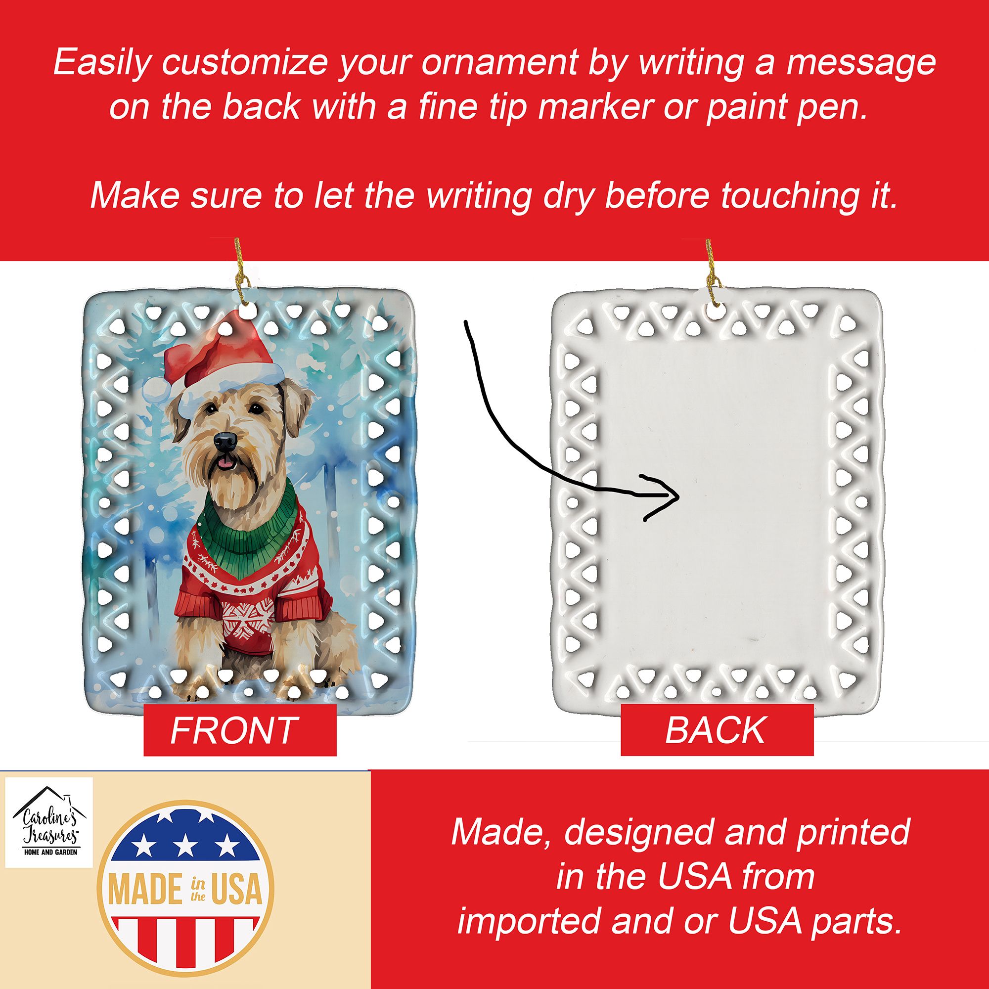 Porcelain Ornament featuring breed specific Soft Coated Wheaten Terrier artwork. Celebrate Christmas with this Christmas Ornament. Add a unique, personal touch to your holiday decor with our Rectangular Lattice Porcelain Ornament. Perfect for creating cherished memories, this high-quality ornament shines under festive lights, reflecting warmth and joy throughout your Christmas tree. Crafted with a glossy finish, it showcases vibrant, full-color artwork contributed by our talented artists, ensuring your tree is adorned with a burst of color and holiday spirit. What sets this Porcelain Ornament apart is its customizable white back. Use a paint pen or permanent marker to write a heartfelt message, commemorate a special year, or mark an unforgettable date, turning this ornament into a keepsake that will be treasured for years to come. For best results, allow any personalization to dry thoroughly before handling. Each ornament comes complete with a delicate gold cord, making it easy to hang and display. Proudly made in the USA, this ornament measures 3.375 x 2.625 inches and is a thoughtful gift for pet sitters, teachers, family members, or anyone who would appreciate a little extra holiday magic. Bring style, charm, and a touch of personal meaning to your Christmas tree with this beautifully designed ornament..