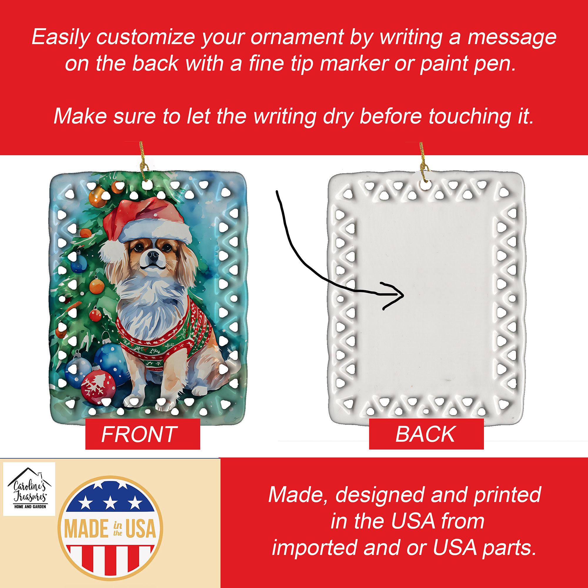 Porcelain Ornament featuring breed specific Tibetan Spaniel artwork. Celebrate Christmas with this Christmas Ornament. Add a unique, personal touch to your holiday decor with our Rectangular Lattice Porcelain Ornament. Perfect for creating cherished memories, this high-quality ornament shines under festive lights, reflecting warmth and joy throughout your Christmas tree. Crafted with a glossy finish, it showcases vibrant, full-color artwork contributed by our talented artists, ensuring your tree is adorned with a burst of color and holiday spirit. What sets this Porcelain Ornament apart is its customizable white back. Use a paint pen or permanent marker to write a heartfelt message, commemorate a special year, or mark an unforgettable date, turning this ornament into a keepsake that will be treasured for years to come. For best results, allow any personalization to dry thoroughly before handling. Each ornament comes complete with a delicate gold cord, making it easy to hang and display. Proudly made in the USA, this ornament measures 3.375 x 2.625 inches and is a thoughtful gift for pet sitters, teachers, family members, or anyone who would appreciate a little extra holiday magic. Bring style, charm, and a touch of personal meaning to your Christmas tree with this beautifully designed ornament..