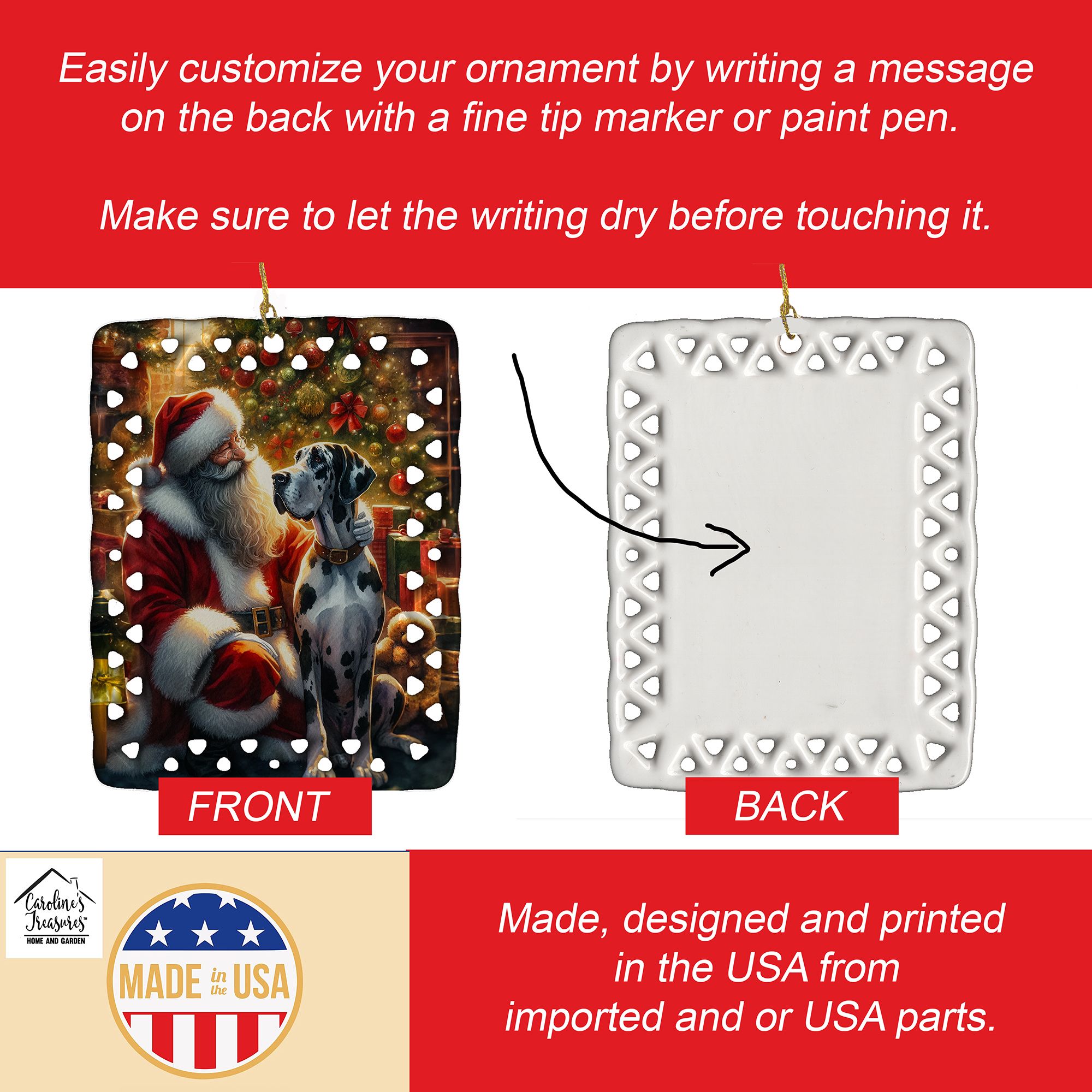 Porcelain Ornament featuring breed specific Great Dane artwork. Celebrate Christmas with this Christmas Ornament. Add a unique, personal touch to your holiday decor with our Rectangular Lattice Porcelain Ornament. Perfect for creating cherished memories, this high-quality ornament shines under festive lights, reflecting warmth and joy throughout your Christmas tree. Crafted with a glossy finish, it showcases vibrant, full-color artwork contributed by our talented artists, ensuring your tree is adorned with a burst of color and holiday spirit. What sets this Porcelain Ornament apart is its customizable white back. Use a paint pen or permanent marker to write a heartfelt message, commemorate a special year, or mark an unforgettable date, turning this ornament into a keepsake that will be treasured for years to come. For best results, allow any personalization to dry thoroughly before handling. Each ornament comes complete with a delicate gold cord, making it easy to hang and display. Proudly made in the USA, this ornament measures 3.375 x 2.625 inches and is a thoughtful gift for pet sitters, teachers, family members, or anyone who would appreciate a little extra holiday magic. Bring style, charm, and a touch of personal meaning to your Christmas tree with this beautifully designed ornament..